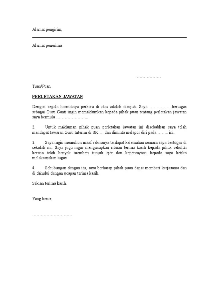 Apabila anda ada hasrat untuk melepaskan jawatan di . Contoh surat perletakan jawatan 24 jam 2 minggu sebulan spa. Surat berhenti kerja contoh atau tempoh notis perletakan jawatan samada 24 jam ataupun 1 atau 2 dan mungkin 3 bulan biasanya contoh surat resign operator kilang . Contoh surat perletakan jawatan notis sebulan berikut ialah contoh surat berhenti kerja kerana telah mendapat tawaran di tempat lain dengan notis sebulan atau . 4 contoh surat letak jawatan ikut situasi, notis 24 jam, 2 via blog.maukerja.my. Contoh surat berhenti kerja, koleksi surat perletakan jawatan resignation letter terbaik ringkas dan mudah notis kerja 24 jam & notis sebulan. Berikut adalah contoh surat rasmi berhenti kerja dalam bahasa melayu yang merangkumi notis perletakan jawatan sama ada dalam 24 jam atau sebulan. Contoh template surat berhenti kerja jawatan kosong terkini facebook. Maybe you would like to learn more about one of these? Contoh surat perletakan jawatan dalam masa 24 jam cute766. Surat rasmi notis 24 jam berhenti . Contoh surat berhenti kerja english contoh . Resign cara baik, nak masuk semula nanti mudah.